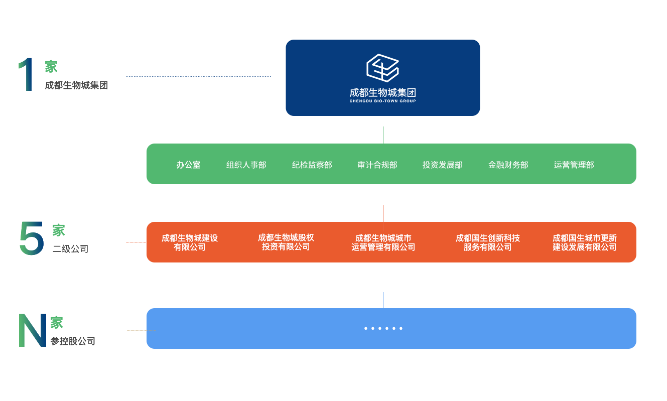 目前,集團按照“1+5+N”三級架構(gòu)下設(shè)5個二級子公司,成都生物城建設(shè)有限公司、成都生物城股權(quán)投資有限公司、成都生物城城市運營管理有限公司、成都國生創(chuàng)新科技服務(wù)有限公司、成都國生城市更新建設(shè)發(fā)展有限公司。在三級公司積極推進國企混改,引入社會優(yōu)質(zhì)戰(zhàn)略投資者,與中石油、格力、國藥、華西等行業(yè)龍頭成立合資企業(yè)10家,參股成都威斯克生物醫(yī)藥有限公司、成都海楓生物科技有限公司、成都天府國際生物城供應(yīng)鏈服務(wù)有限公司等企業(yè)。集團資產(chǎn)規(guī)模超300億元,已獲得AAA主體信用評級,通過ISO9001質(zhì)量管理體系認證、ISO14001環(huán)境管理體系認證、OHSAS18001健康安全管理體系認證,并獲得ISO37301:2021及GB/T35770-2022合規(guī)管理體系雙認證。